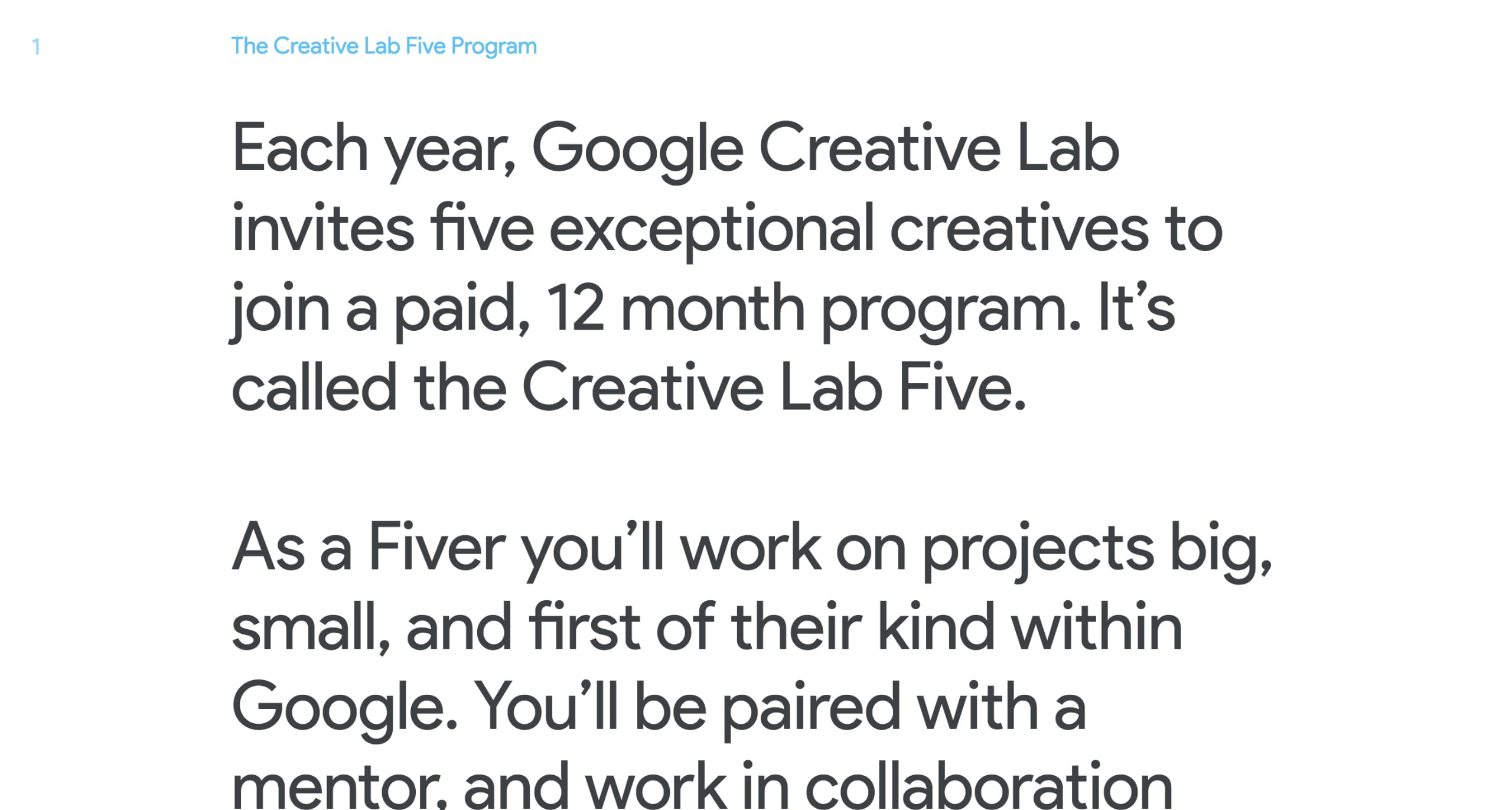 One Pager for Google’s Creative Lab Five internship. Neat touch with the numbered left navigation separated in five sections, the GIF previews on project hover and make sure you check out the application form – very user friendly.