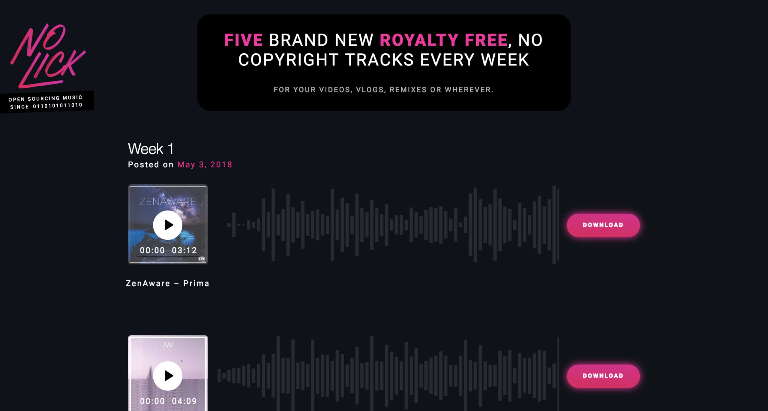 Dark-schemed One Pager announcing a new royalty-free music resource called No Lick by Bart Proost.